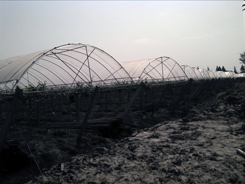 该温室结构简单,造价低廉,主要应用于一些植物避雨的需求,比如葡萄。在梅雨季节可以防止风雨的侵袭。